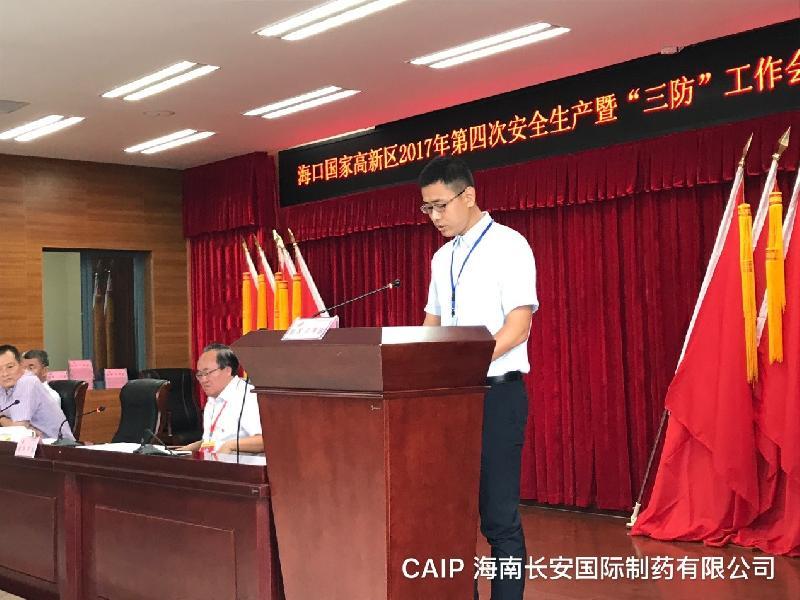 2017年10月20日,在海口國家高新區2017年第四次安全生產暨“三防”工作會議上,海南長安國際制藥有限公司等11家企業在第20號臺風“卡努”期間,積極配合高新區管委會做好防風防汛及臨時避險點的安置工作,獲得“優秀企業”表彰,公司有幸代表受表彰的企業之一受邀上臺發言。