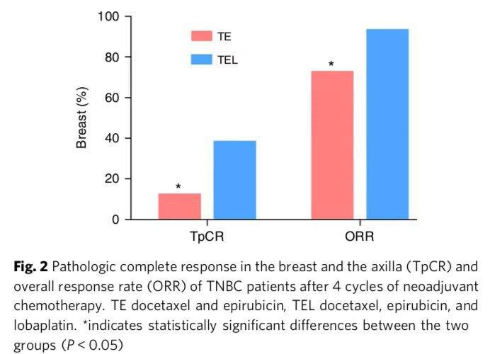 研究結果顯示:多西他賽和表柔比星方案中加入洛鉑作為TNBC的新輔助化療方案與多西他賽和表柔比星方案相比高顯著提高了TpCR率和ORR,毒性可以耐受; 短期來看還可以減少復發(fā)和轉移率。